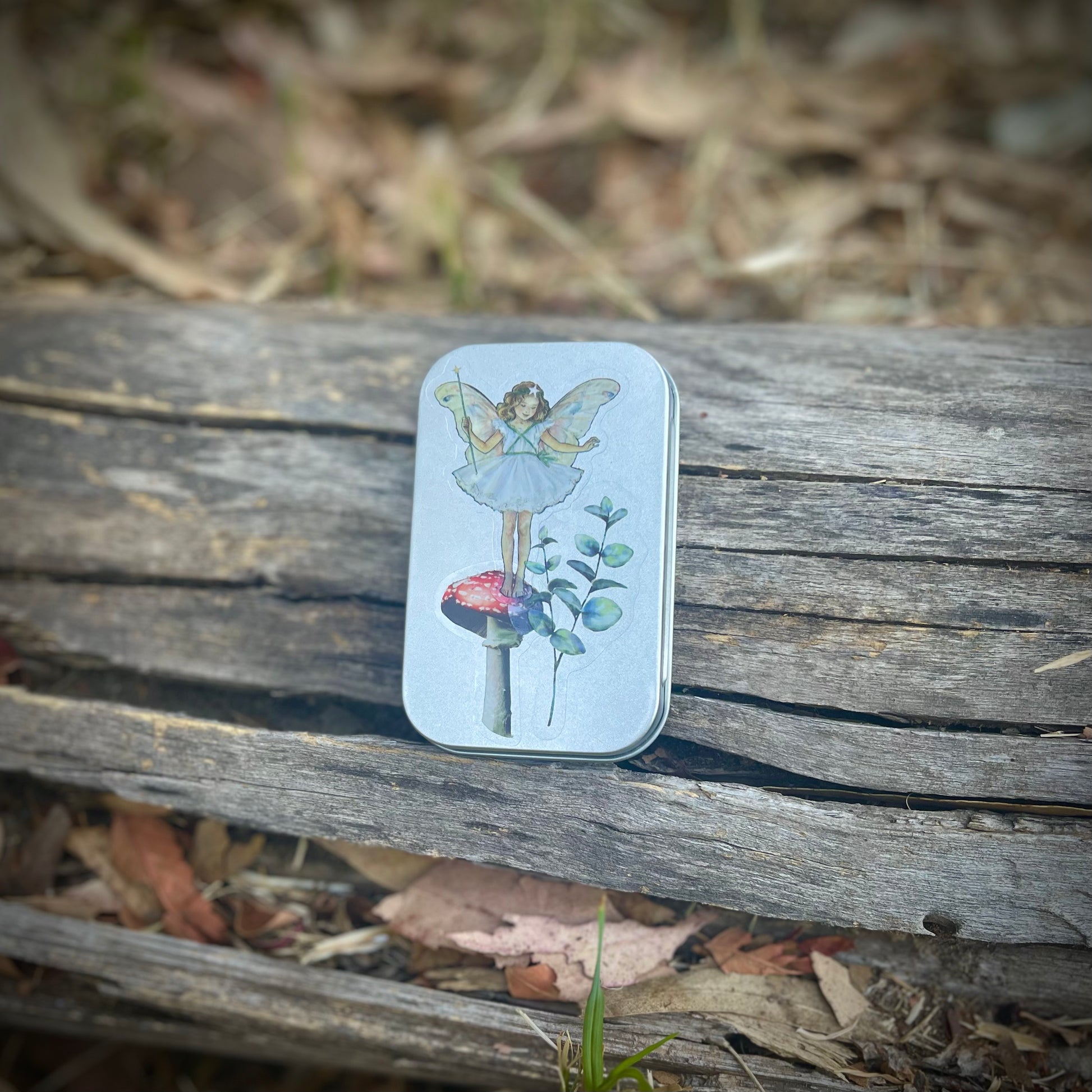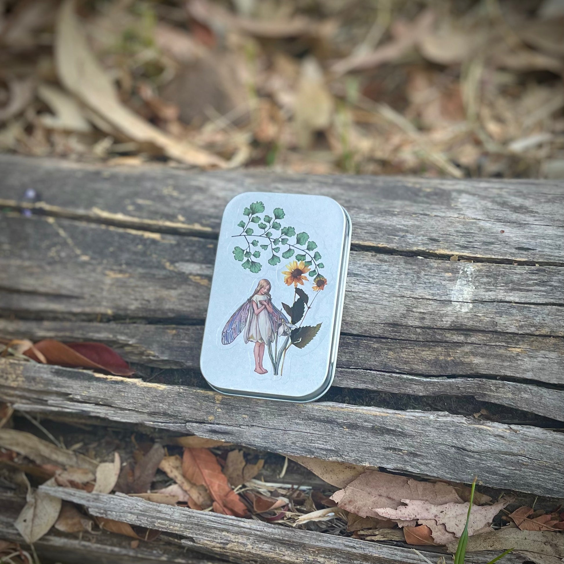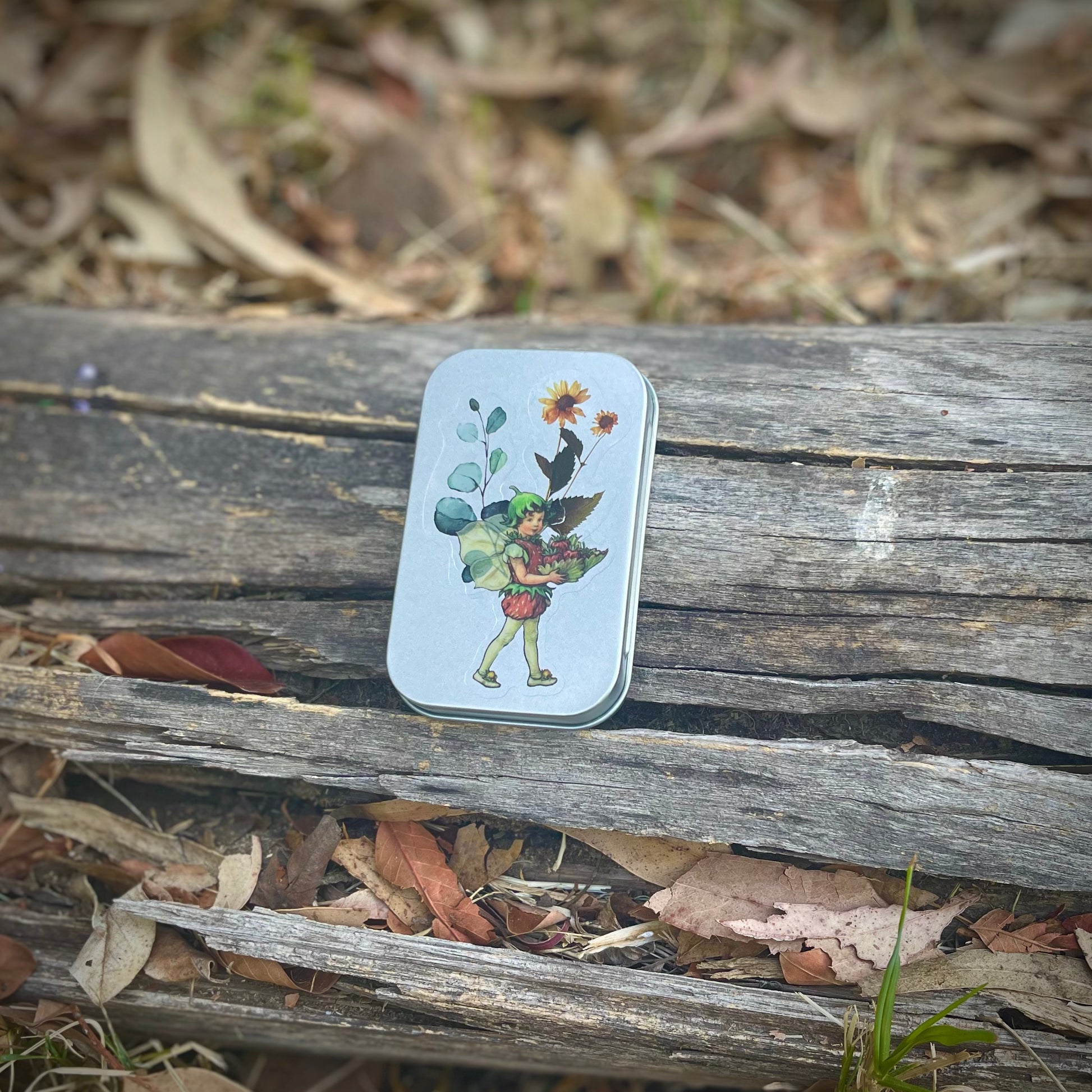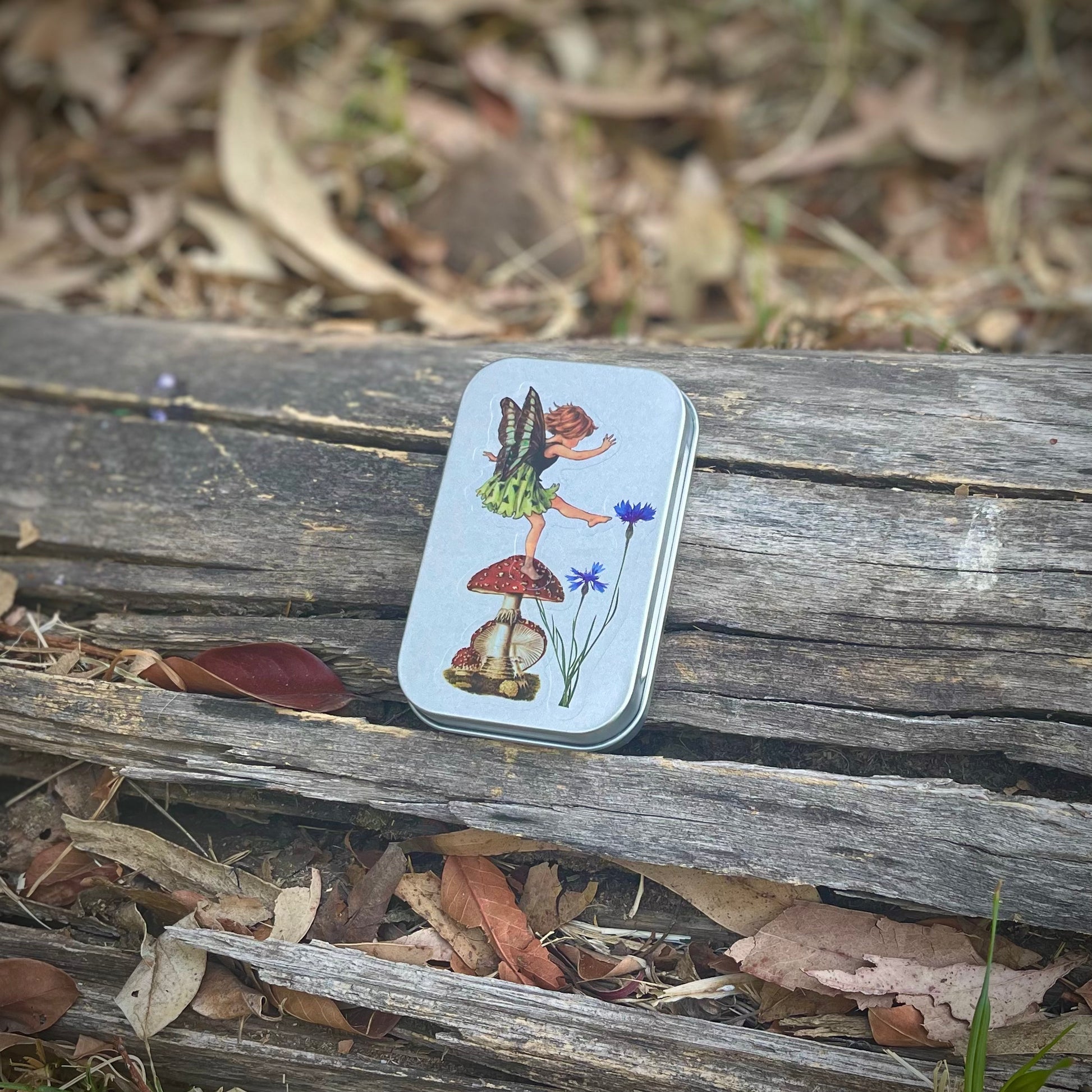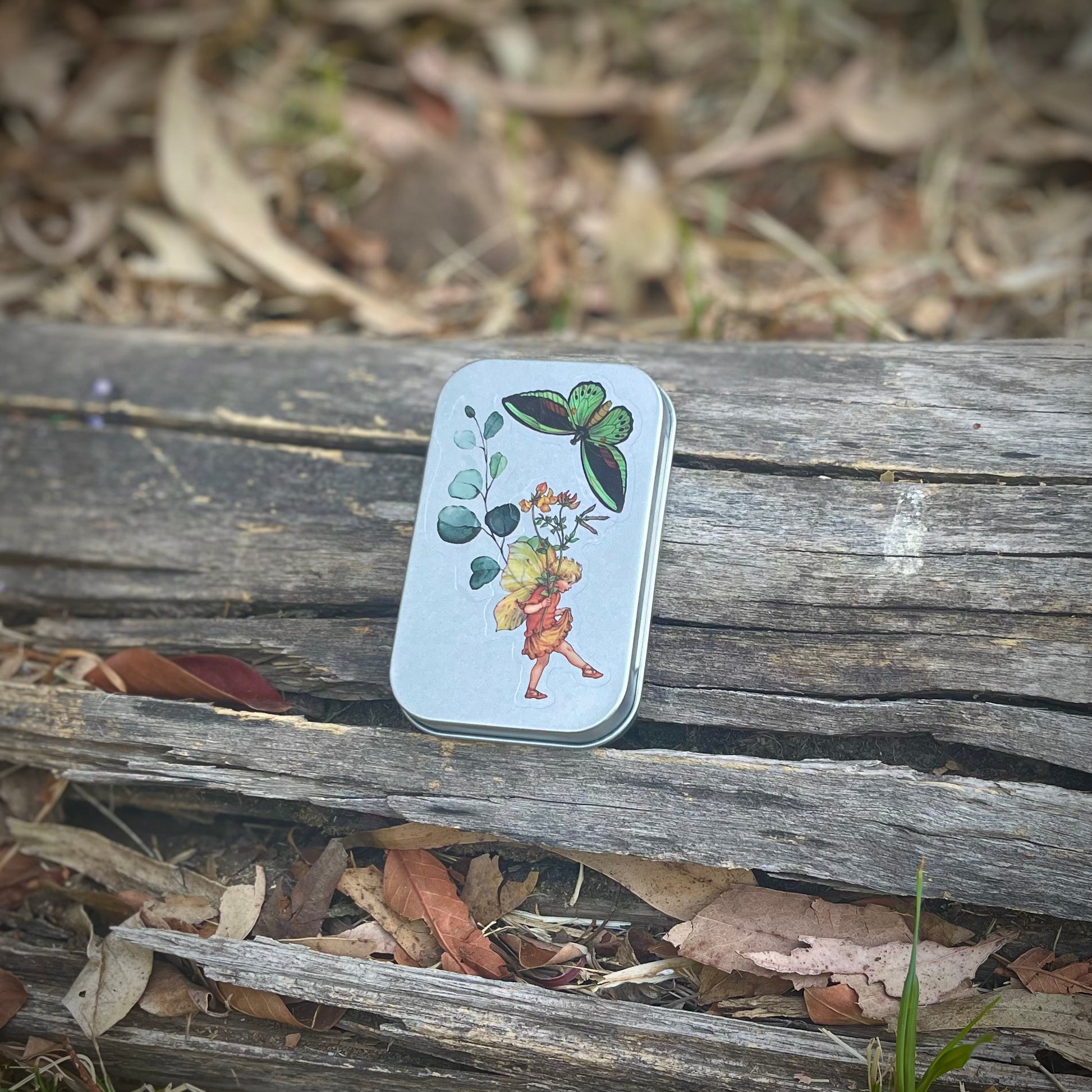 Cajita de lata con 15 stickers surtidos en su interior, de hadas y naturaleza. Todas las portadas son distintas. Se pueden usar como cajitas de tesoros, pastilleros, etc.