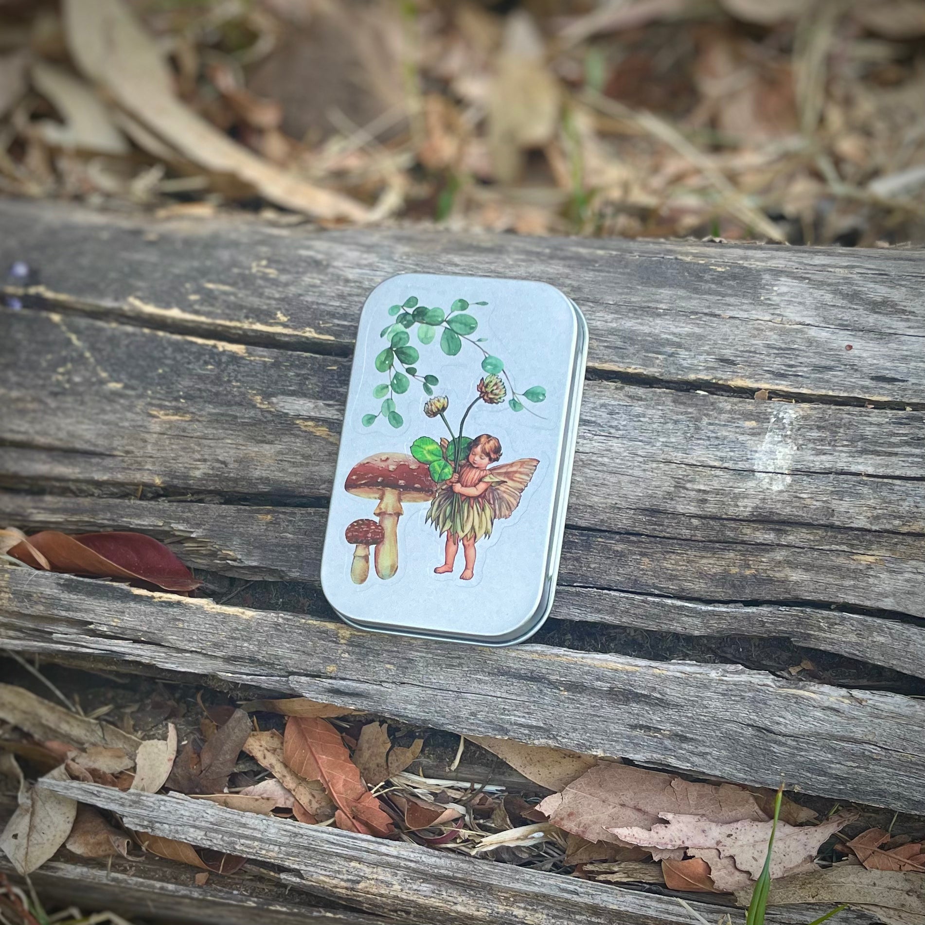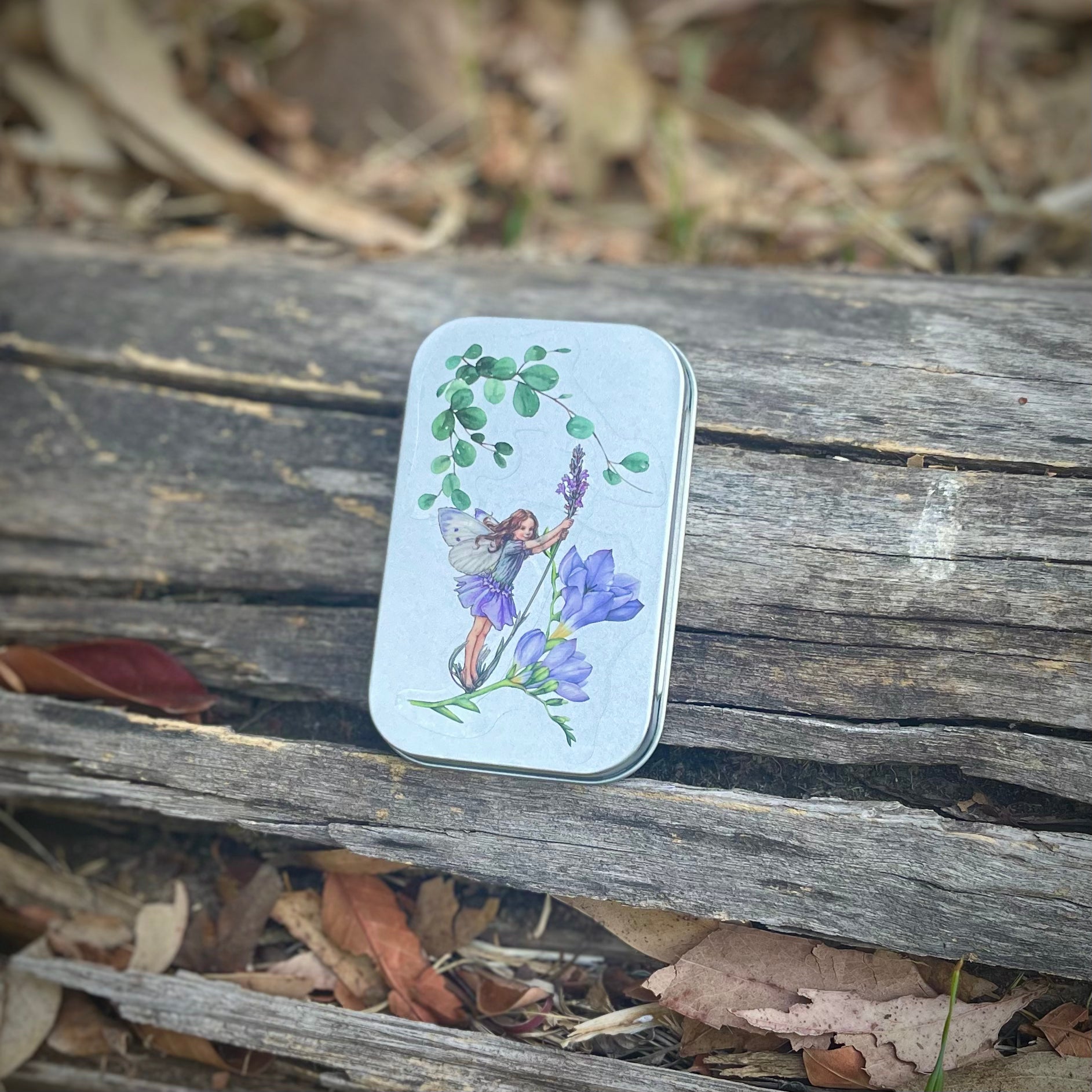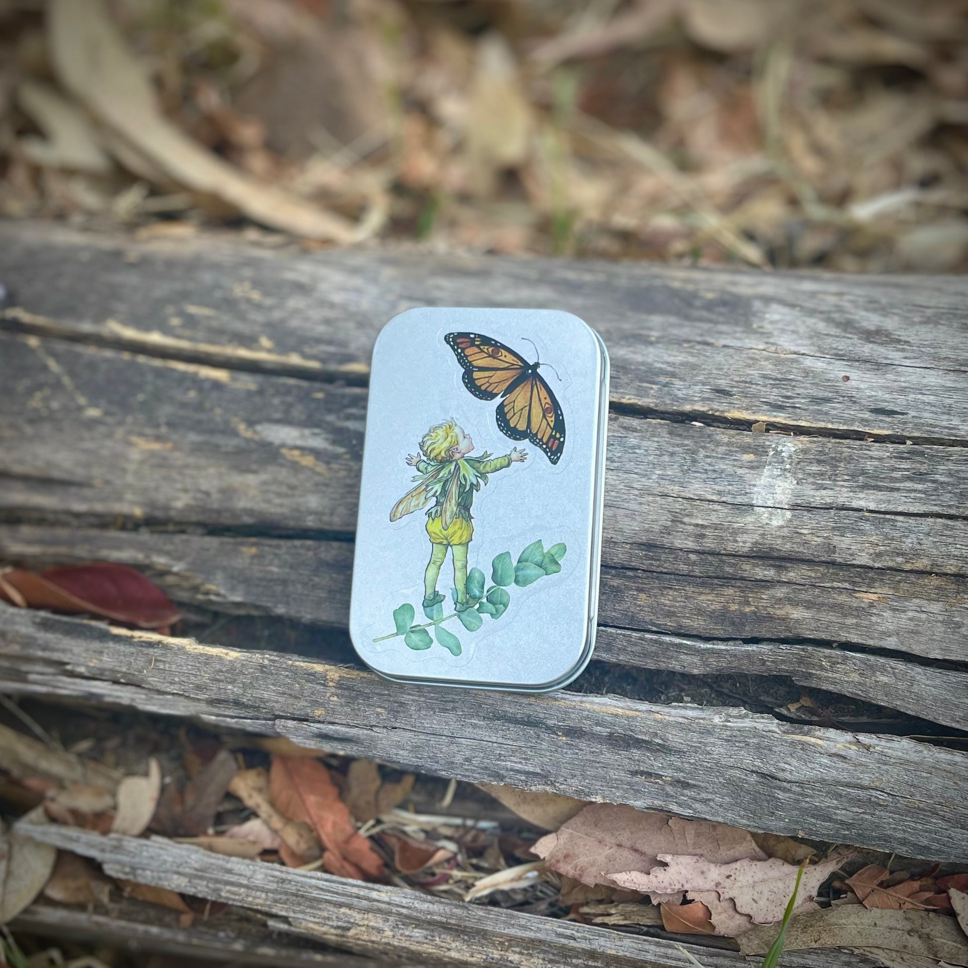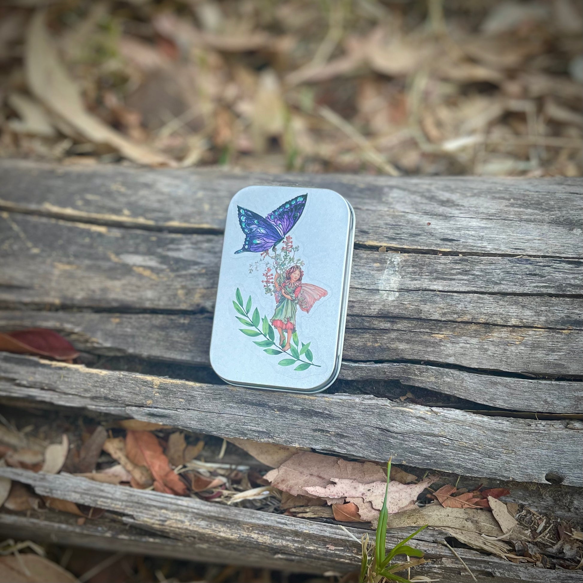 Cajita de lata con 15 stickers surtidos en su interior, de hadas y naturaleza. Todas las portadas son distintas. Se pueden usar como cajitas de tesoros, pastilleros, etc.