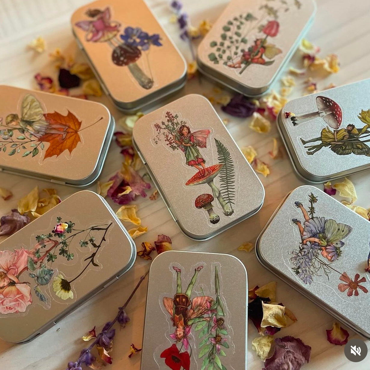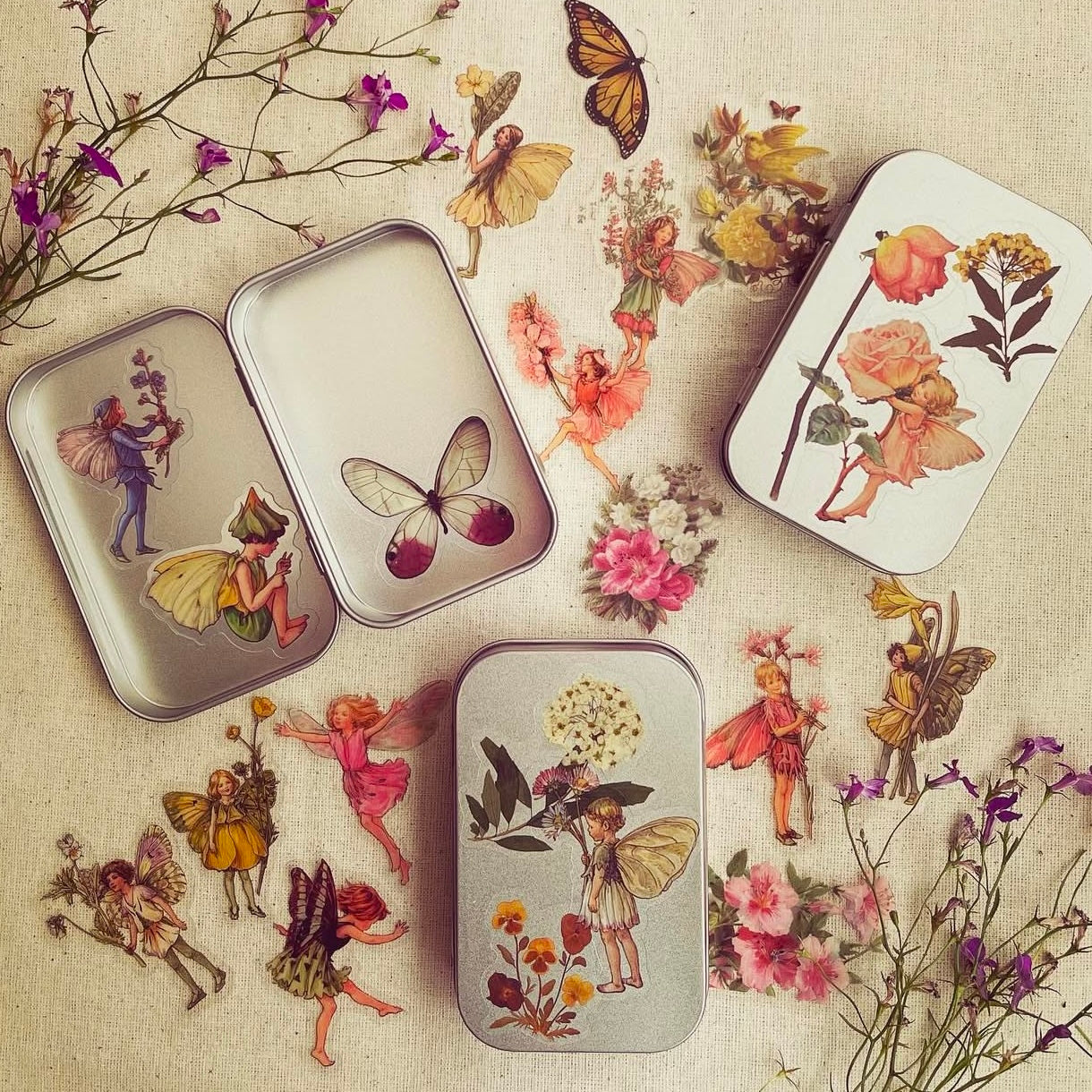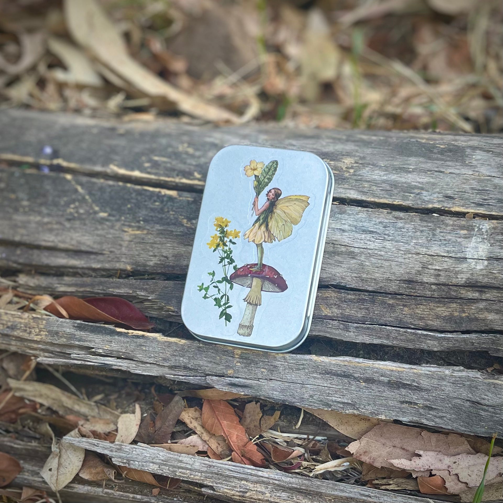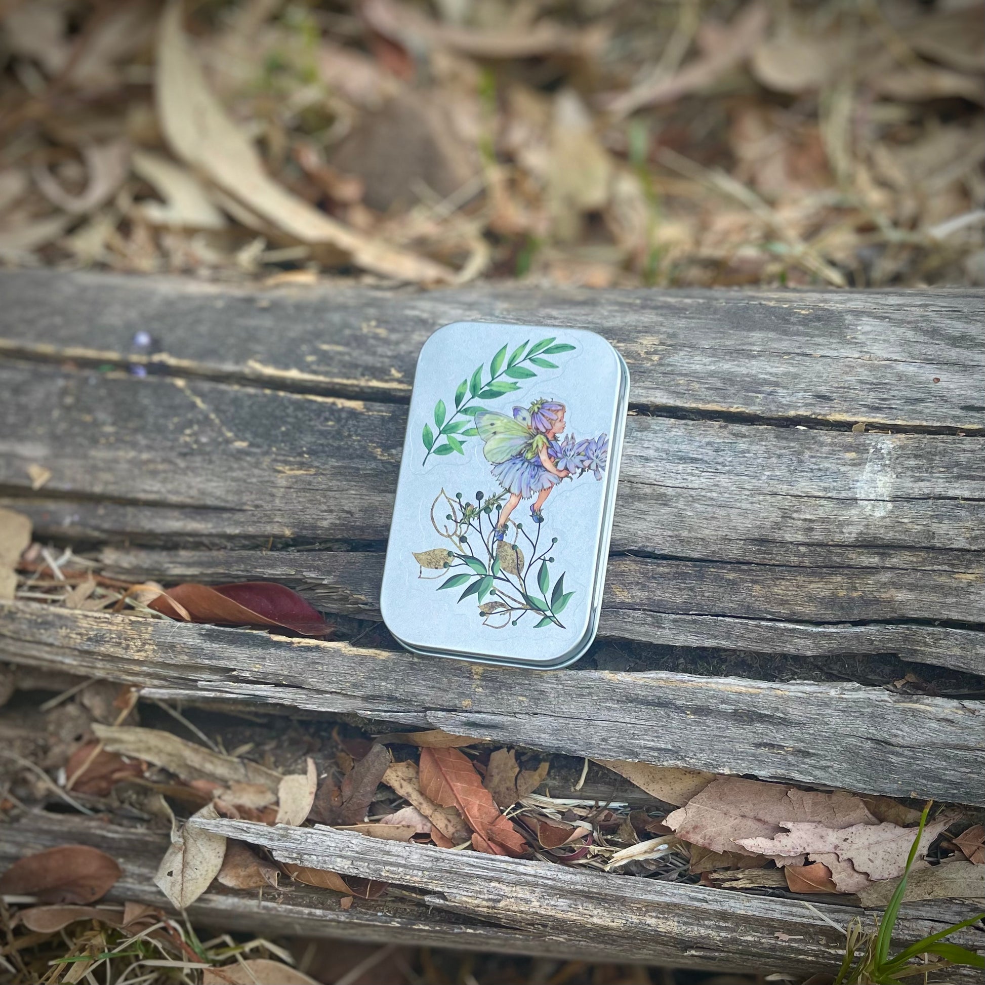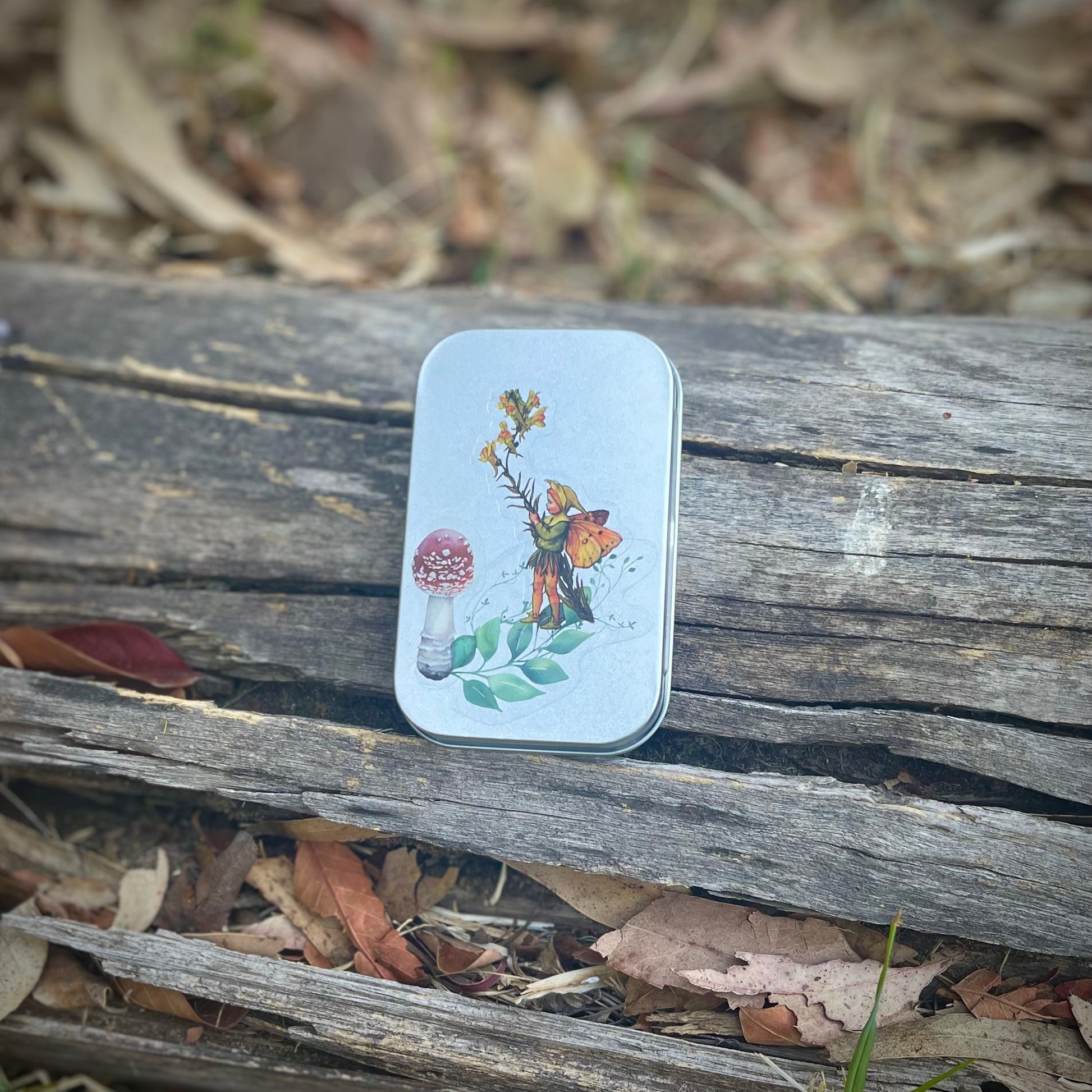 Cajita de lata con 15 stickers surtidos en su interior, de hadas y naturaleza. Todas las portadas son distintas. Se pueden usar como cajitas de tesoros, pastilleros, etc.