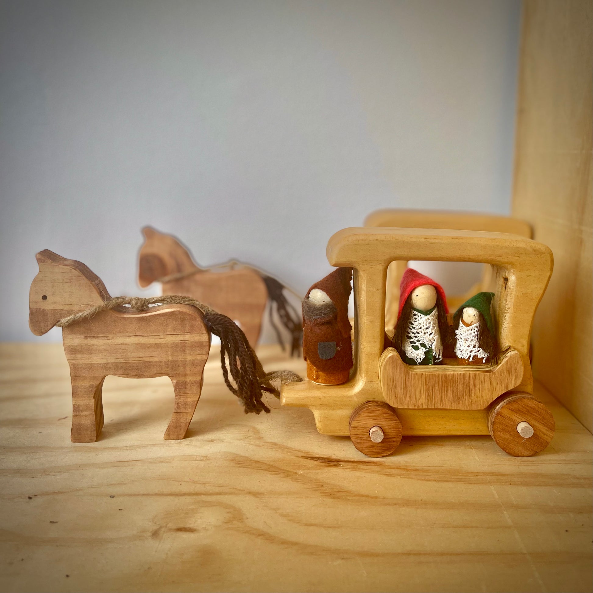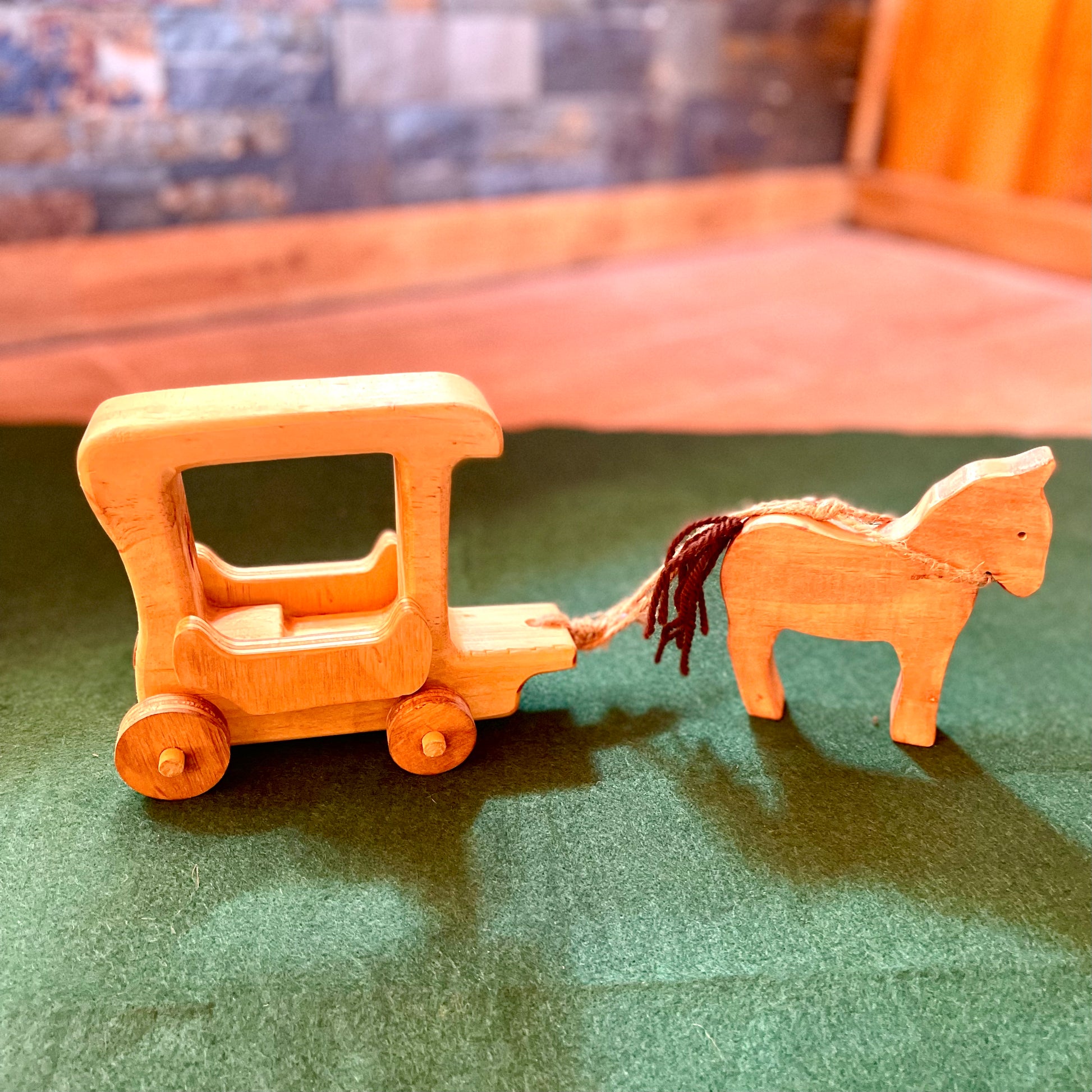 Carruaje de madera sellado con ceras y tintes naturales. Incluye el caballo que se puede separar de las riendas para jugar solo.