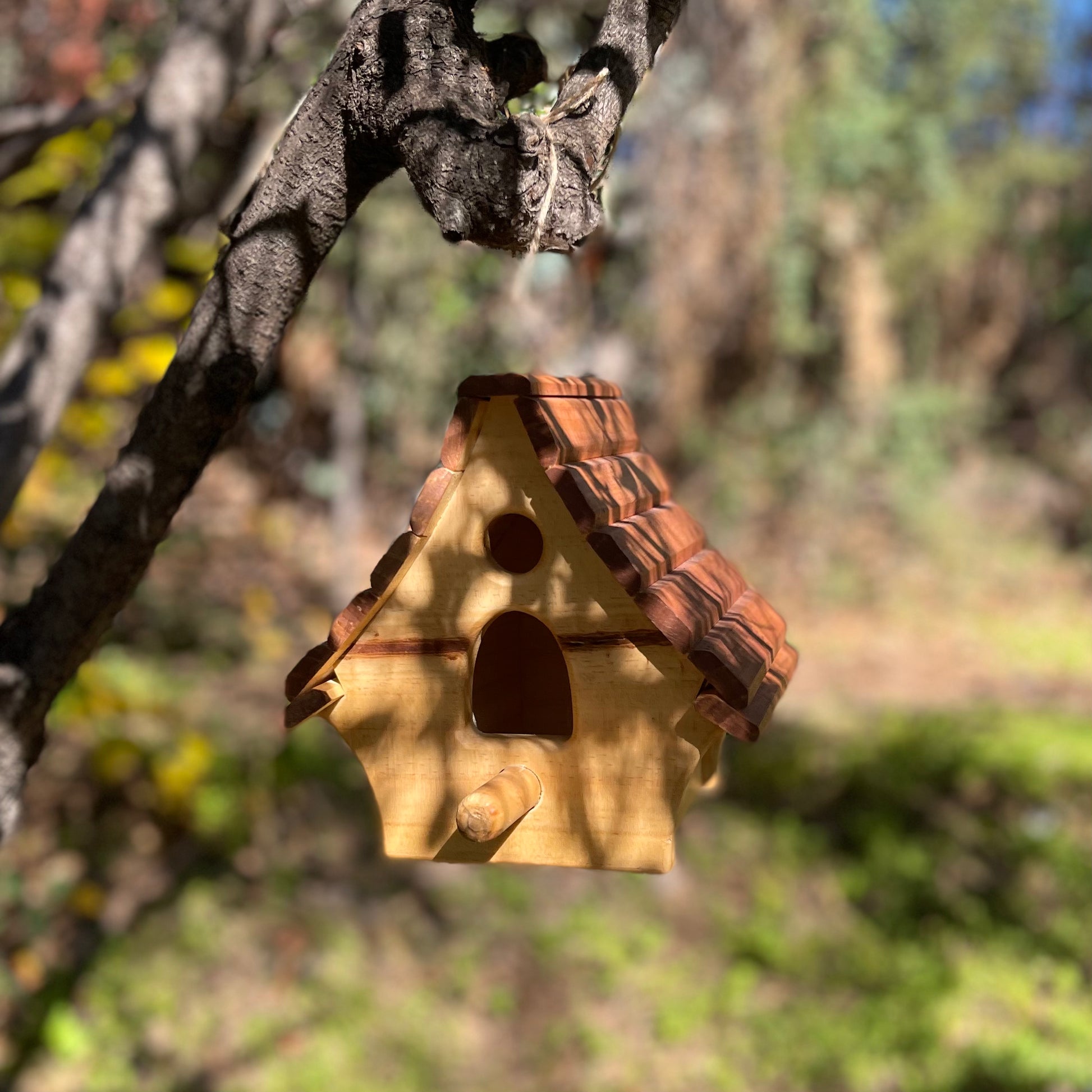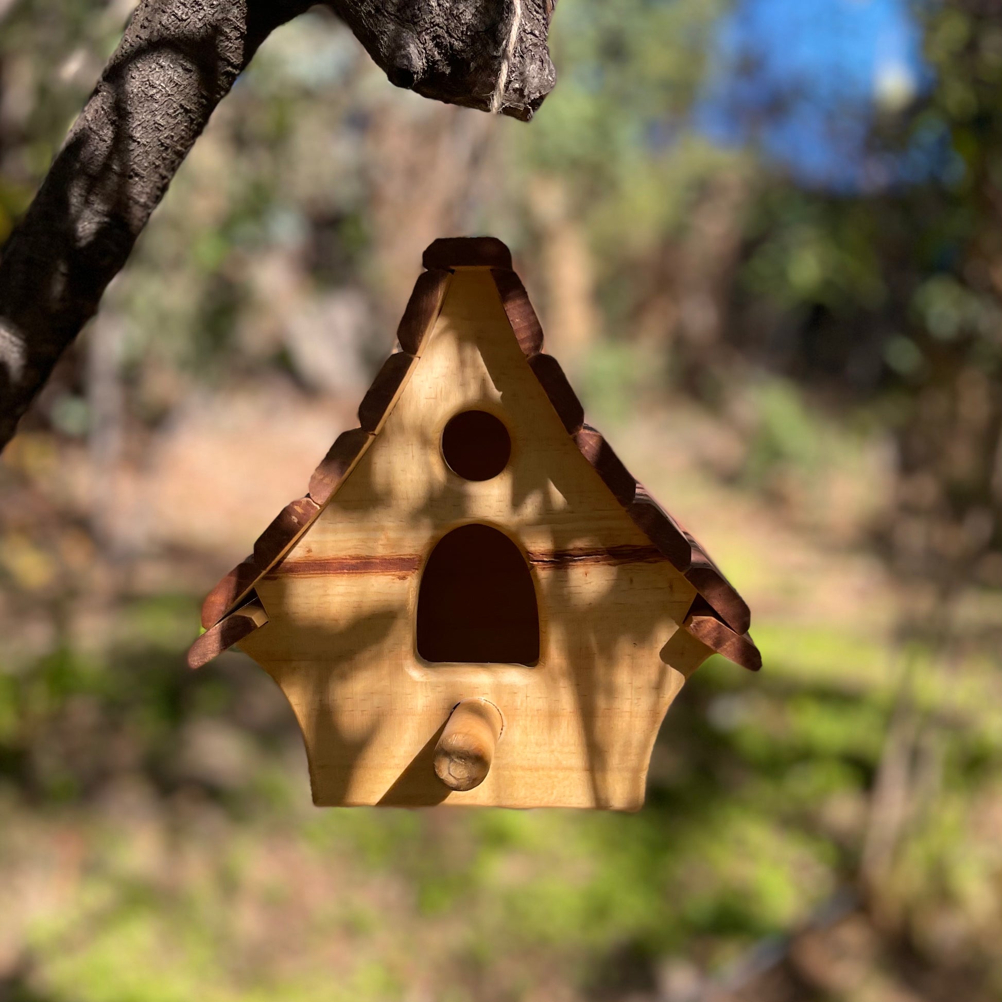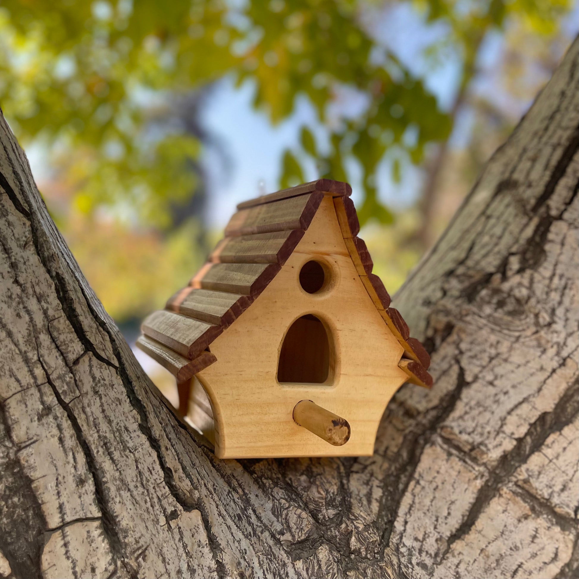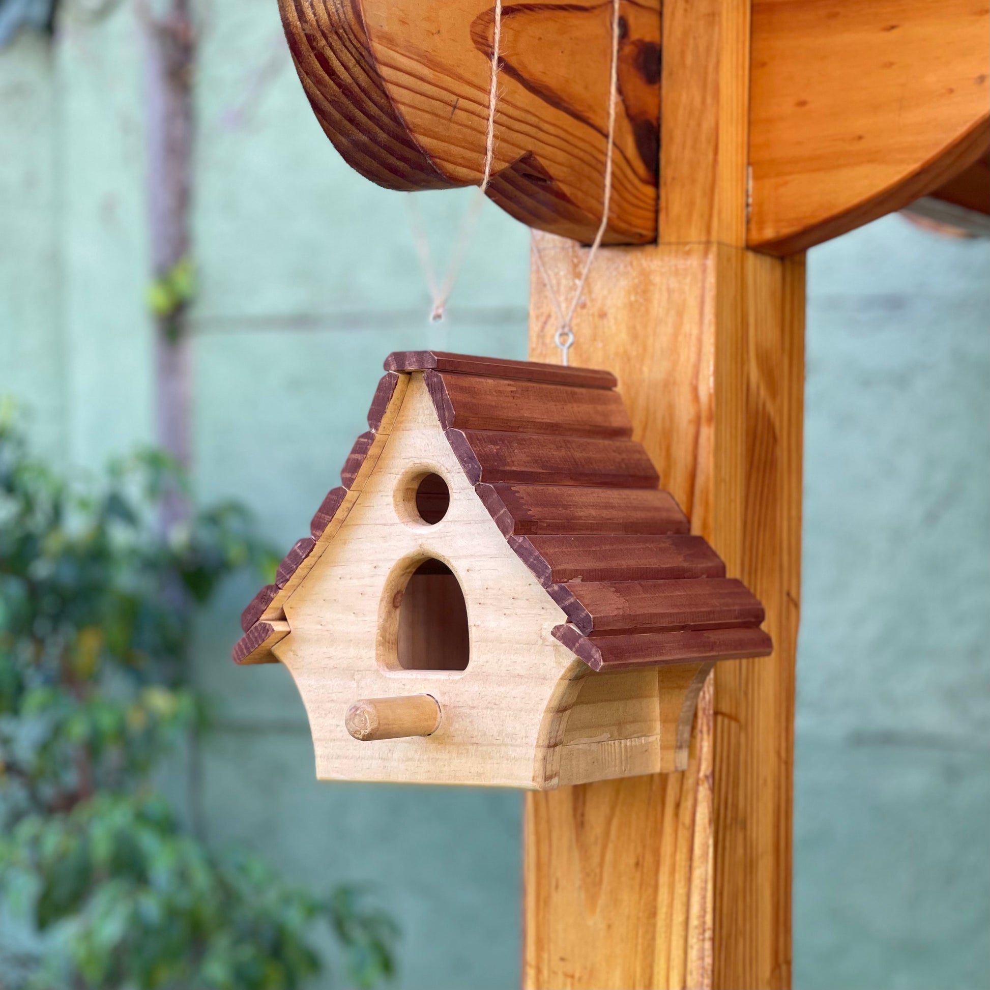 Casa de pájaro de madera sellada con ceras y tintes naturales, fabricada de manera artesanal. Tiene dos ganchitos para darle mayor estabilidad al momento de colgarla, e incluye cáñamo (hilo). También se puede instalar sobreponiéndola en una superficie.