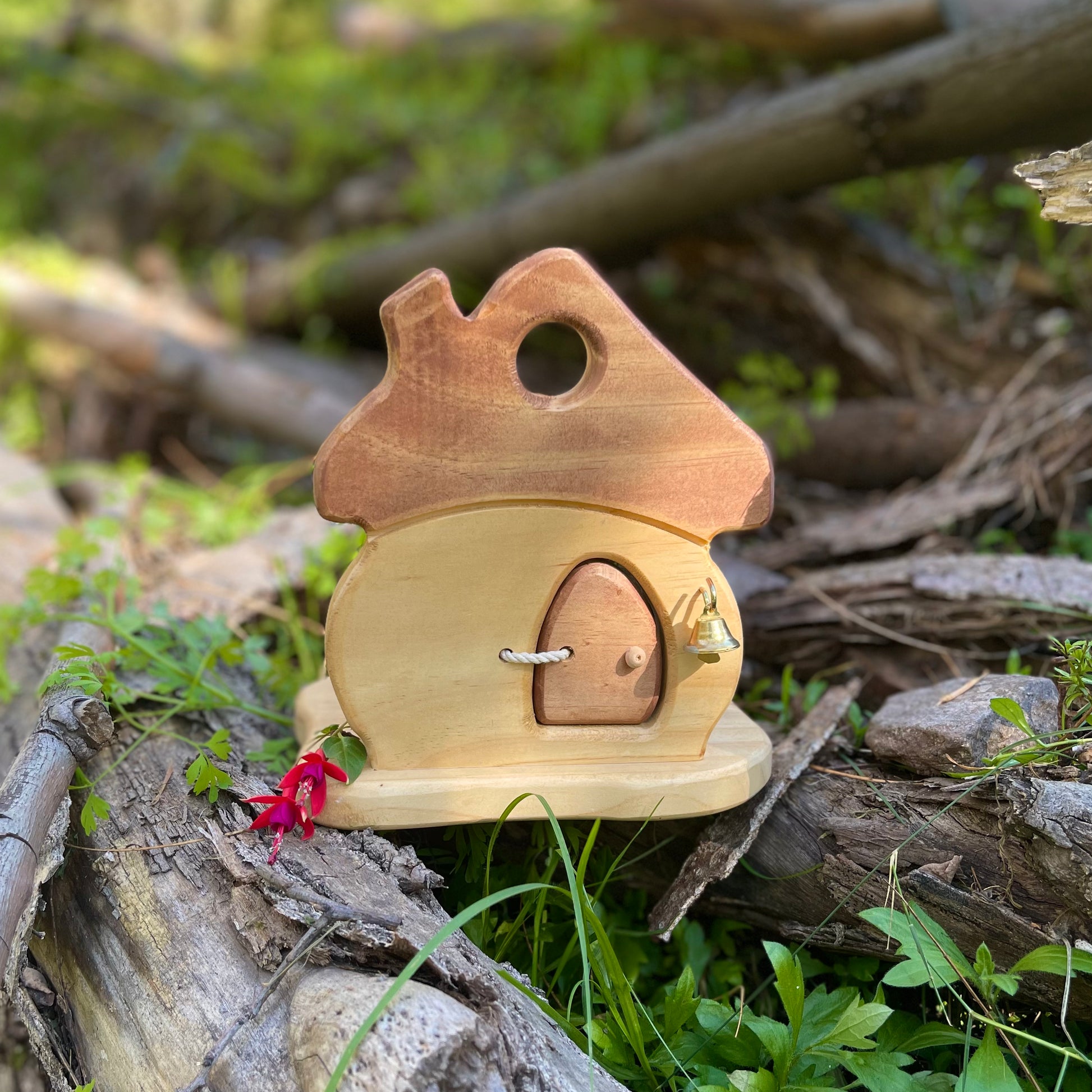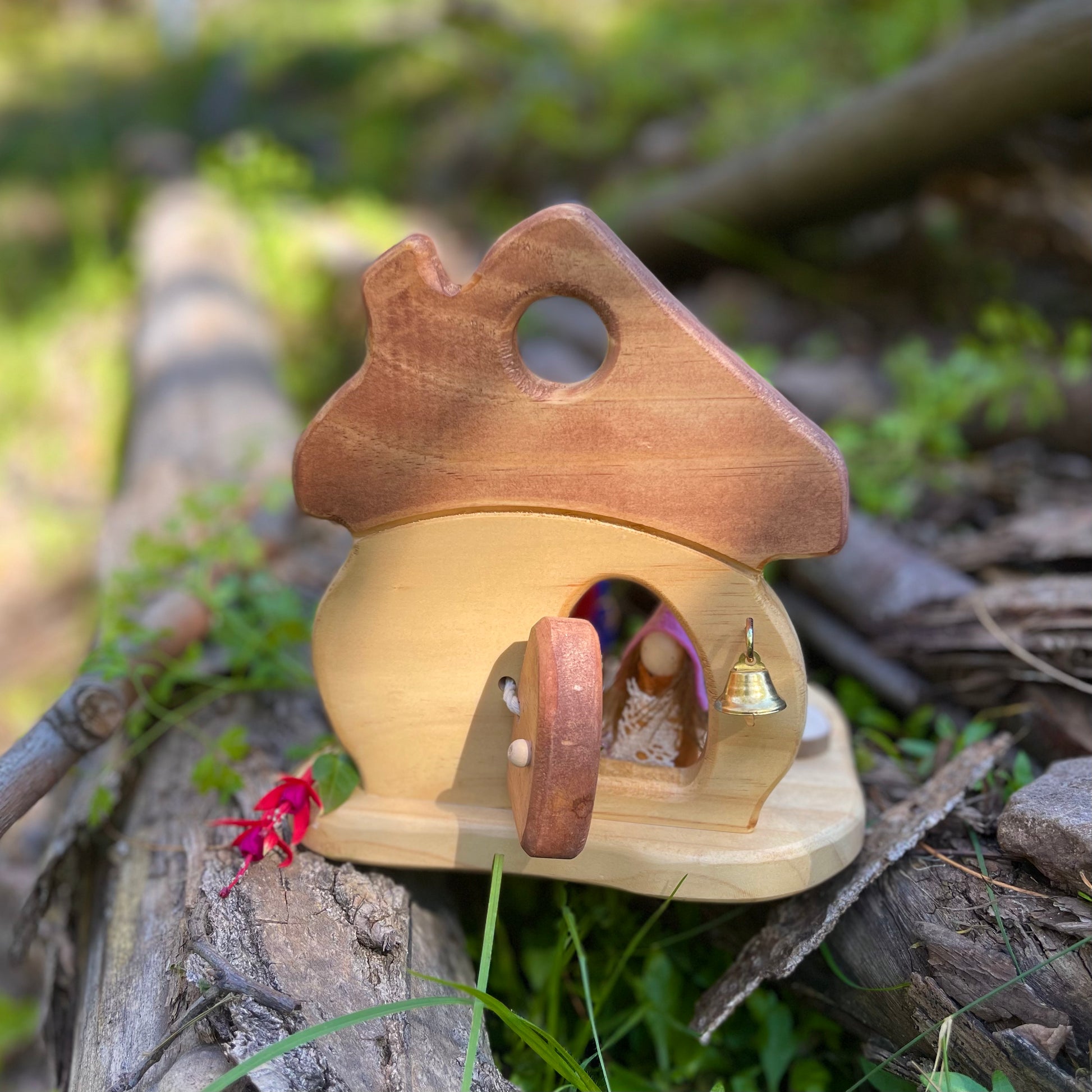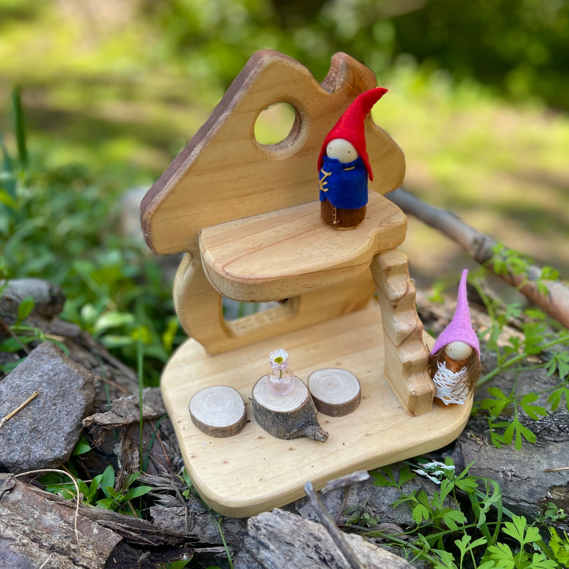 - Casa Gnomo con familia Amanita: Incluye Casa de madera, mesita tronco y familia de madera y pañolenci (3 personajes en total, dos adultos y un niñ@)