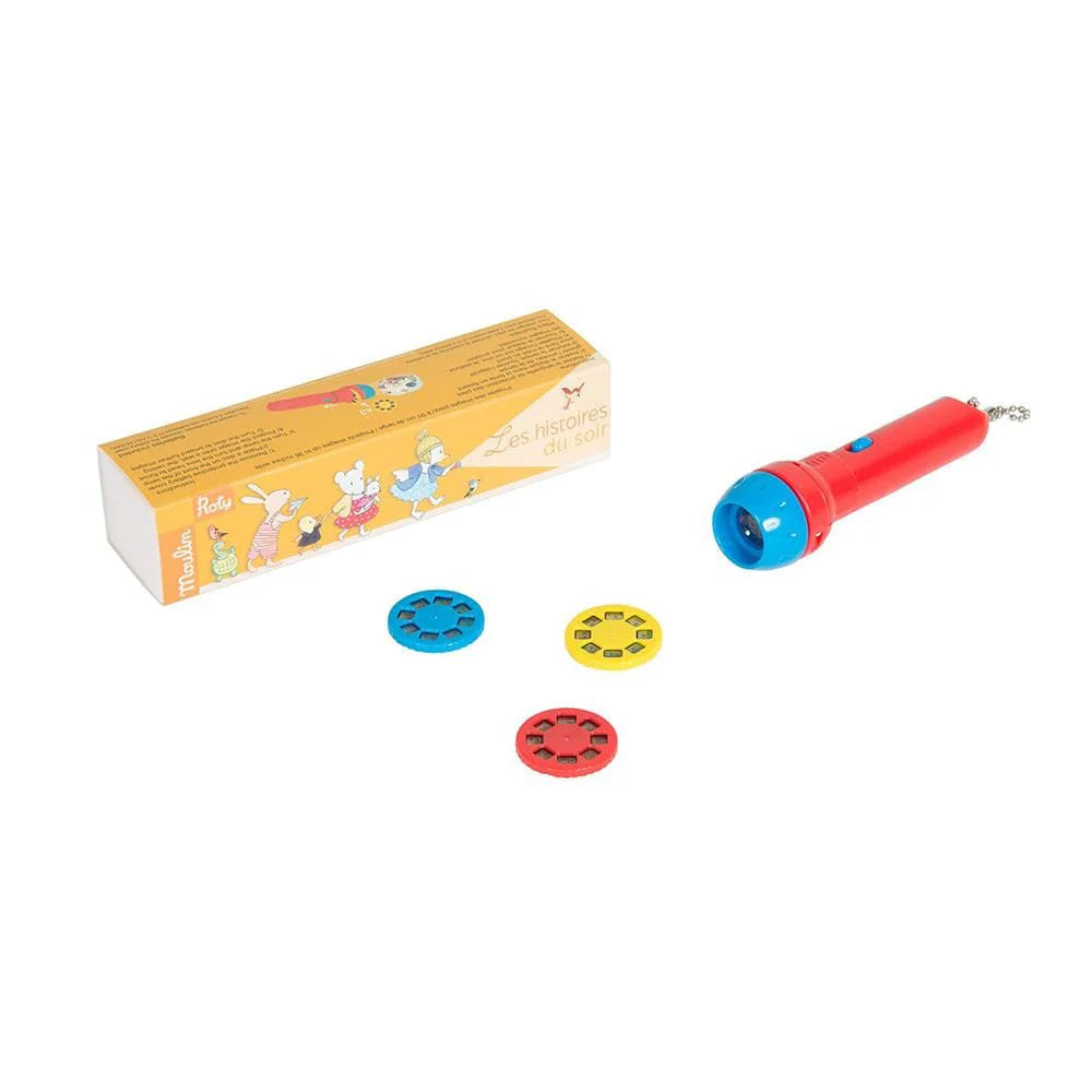Para utilizarla, inserta uno de los 3 discos incluidos, enciendela y enfoca la proyección sobre una superficie. Para cambiar de imagen gira el disco y así continuar la historia. También cuenta con una tuerca delantera para ajustar el enfoque de la linterna.