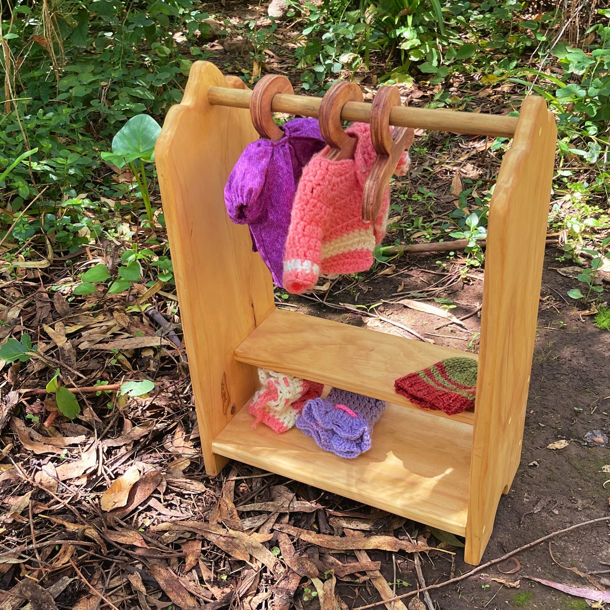 Perchero de madera para ropita de muñecas, sellado con ceras y tintes naturales.