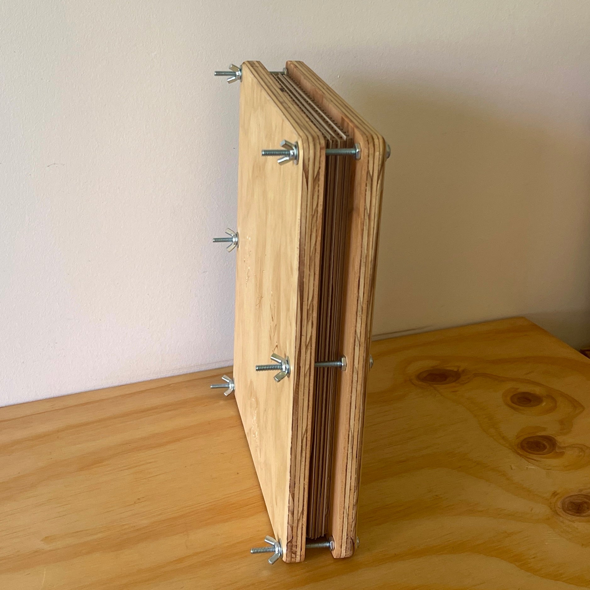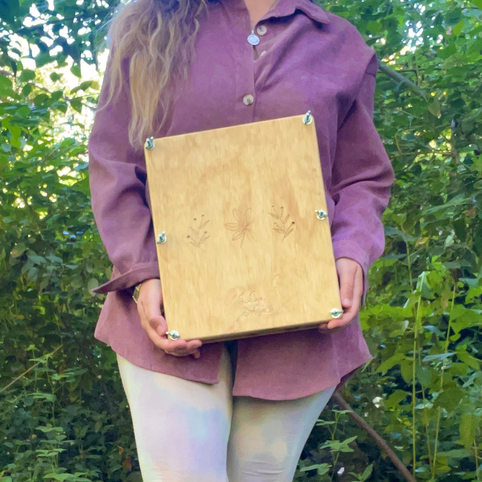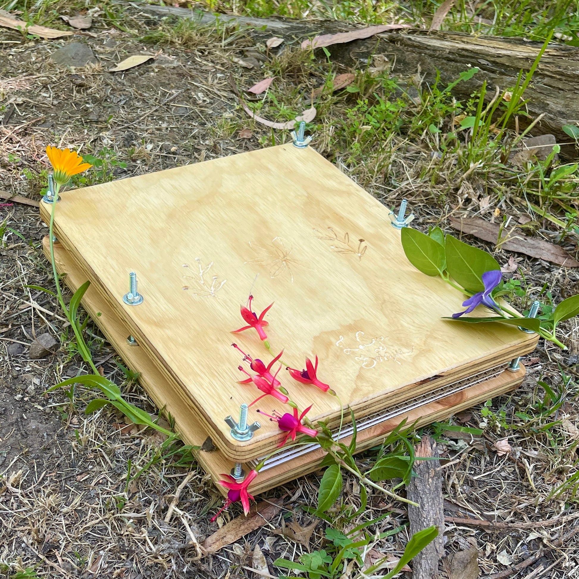 Prensa de madera sellada con ceras y tintes vegetales Alemanes. En su tapa posee grabados inspirados en la naturaleza. Ideal para prensar flores y hojas. Ideal para recolectar bellas flores y hojas, ponerlas en la prensa... esperar... y disfrutar del proceso y tesoros que aparecerán.